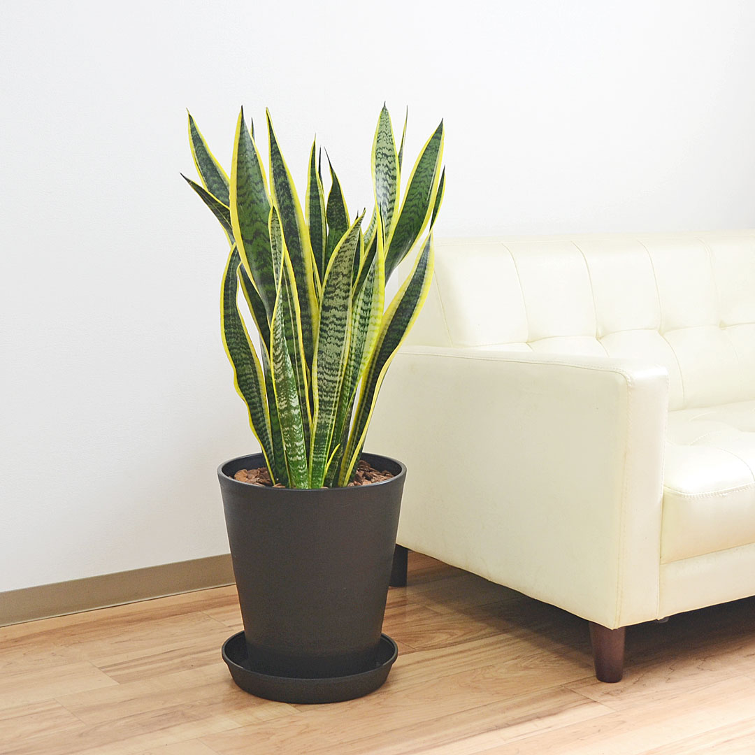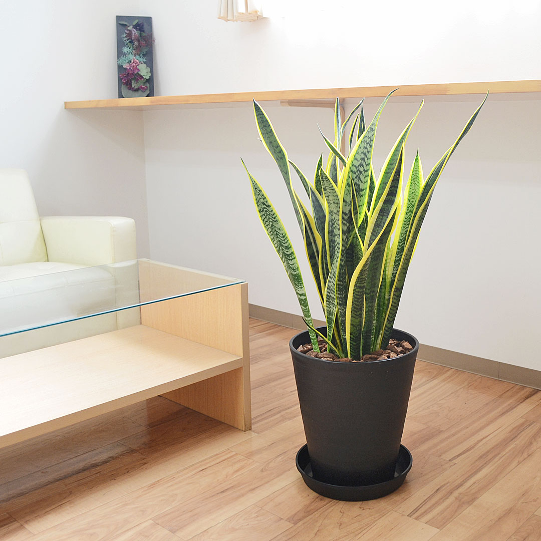 大型でボリュームたっぷりのサンスベリアを10号サイズのブラックのセラート鉢に植えスタイリッシュに仕立てました。プラスチック鉢ですが、高級感もありそのままおしゃれに飾れます。