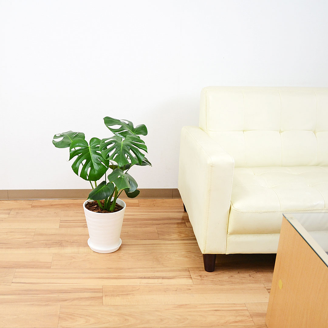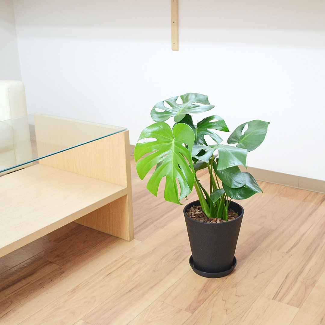 ホワイトとブラックから色を選べるおしゃれなプラスチック鉢を使った飾りやすい大きさのモンステラです。